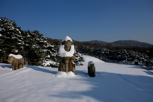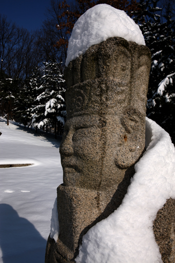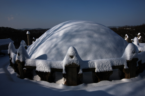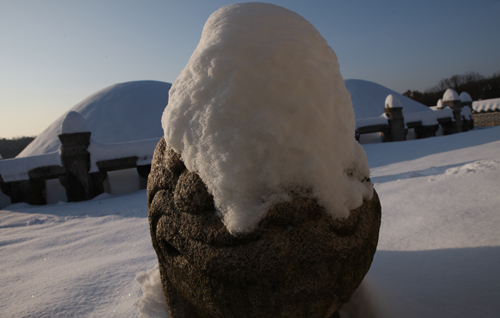 경릉의 소혜왕후 한씨의 능에 있는 호석의 모습이다. 머리에 눈을 이고 있는 모습이 익살스러웠다. 왕릉의 호석들을 보고 있으면 사나운 기상보다는 애완동물처럼 다정한 모습을 하고 있었다. 녀석들을 보고 있노라면 잡귀들이 무서워 도망가기 보다는 왔다가 같이 놀다 가겠다는 생각이 들었다.
