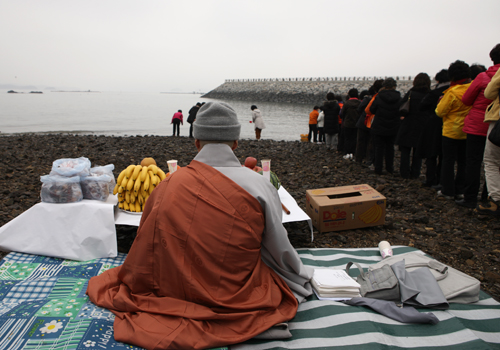 불자들이 방생하는 동안 스님은 기도를 드리고 있었다.