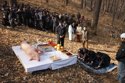 전주 이씨 대동종약원 준경묘 봉향회 이승복 회장의 주관으로 광화문 빛 숭례문 복원에 사용될 금강소나무를 벌채,공급하기에 앞서 안전작업을 기원하는 고유제를 전례에 맞춰 경건하게 지내고 있었다.
