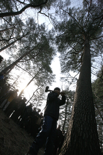 베어진 금강송과 산신제를 지내고 허리에 북어와 실을 차고 있는 금강송, 3번이라는 번호표를 달고 있는 금강송까지 광화문과 숭례문의 복원을 위해 한 목숨 내놓을 금강소나무들이 한 자리에 있었다. 저 나무들에게 미안한 감정이 들었다. 방화로 불탄 숭례문 복원자재로 벌목되는 저 소나무들이 숭례문의 기둥이 되어 ‘고맙소’ 할 것 같지 않았기 때문이다.