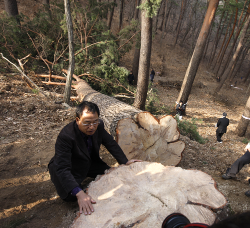 도끼로 벌목하는 모습을 보여주고 기계톱으로 벌목하였다. 몰려든 취재진들에 쌓여 광화문 목수팀이 나이테를 세고 있다. 이 곳의 금강소나무들은 경복궁 중수 때 자재로 쓰였다고 한다. 이제 다시준경묘에서 벌목될 금강소나무는 그늘에서 말리는 과정을 거친 후 광화문에 10그루와 숭례문에 10그루가 쓰일 예정이다.