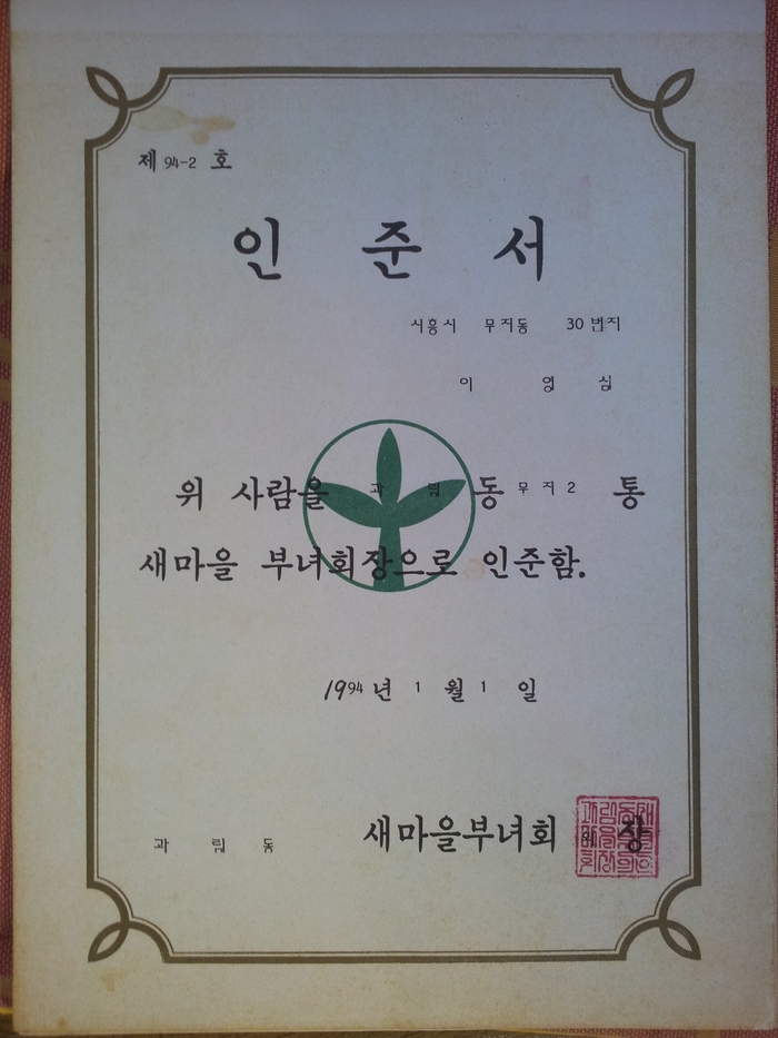 ▲ 새마을부녀회장 위촉장(이영심 제공) © 심우일